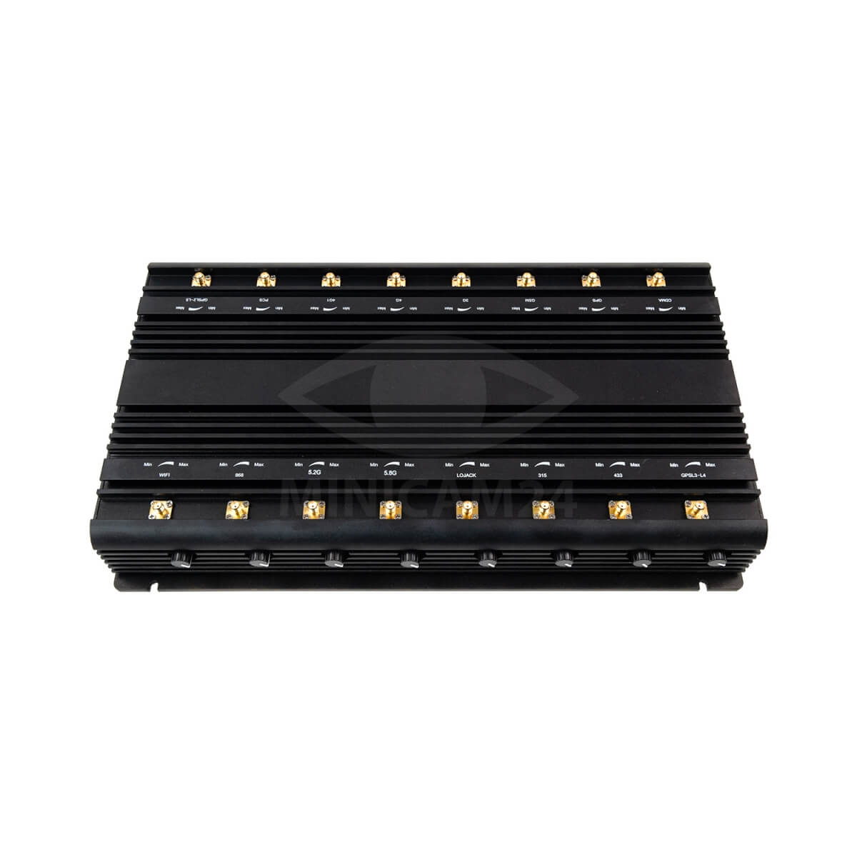 Мощный прибор, который обеспечивает блокировку радиосигналов GSM 2G, 3G, 4G, SDMA, LTE сетей. Устройство также создает помехи, препятствующие приему сигналов GPS, в диапазоне УКВ, на частотах Wi-Fi. Глушилка выполнена в настольном исполнении и обладает сравнительно небольшими, как для устройства с 16-ю частотными независимыми каналами, размерами. Общая выходная мощность антенн составляет 101 Вт. Устройство «глушит» все сигналы в радиусе 10-75 метров. При перегрузке и перегреве постановщики помех могут работать некорректно, поэтому для повышения надежности и продления срока эксплуатации прибора в корпус внедрены 5 вентиляторов, обеспечивающих принудительную вентиляцию. Прибор подключается к сети 220 В через адаптер.